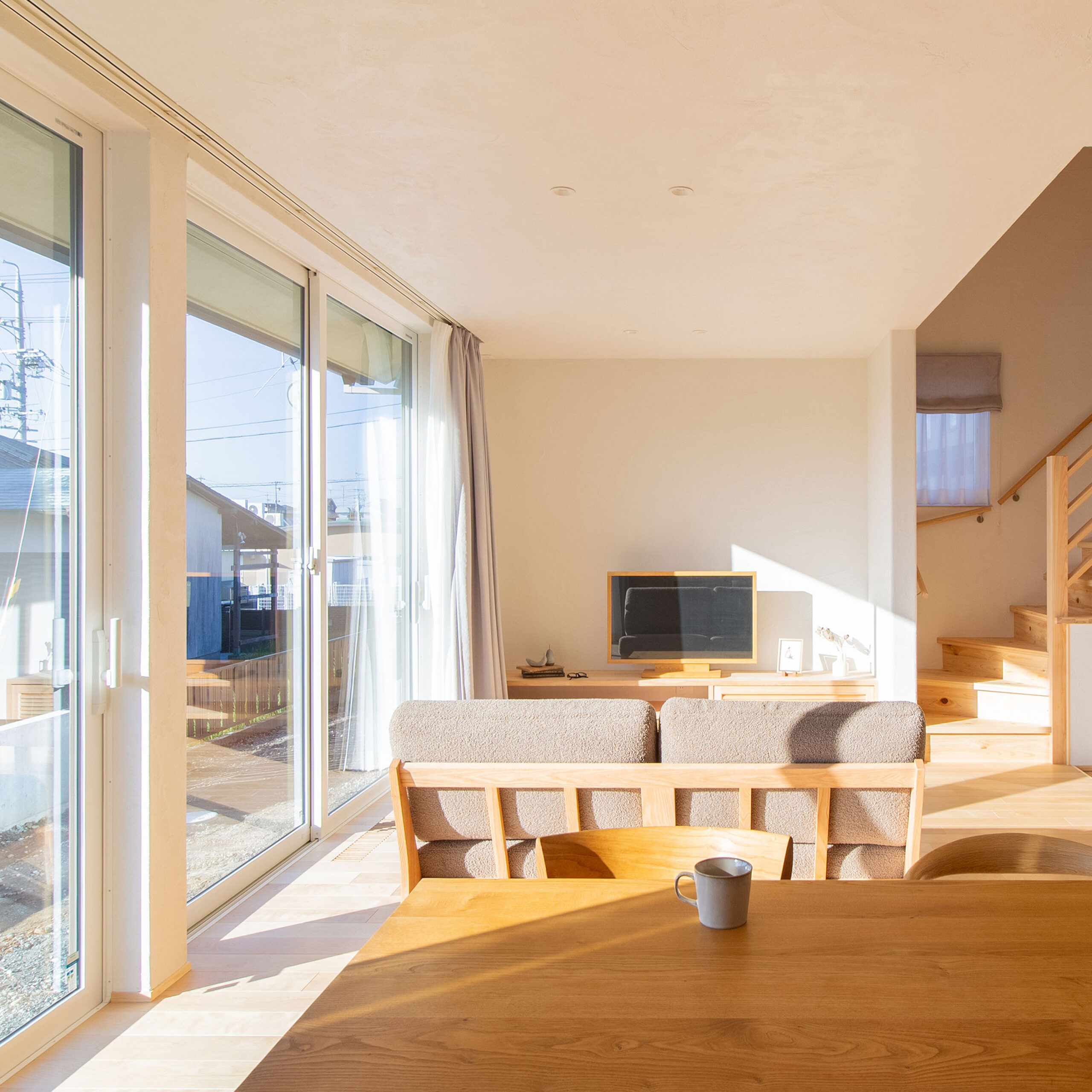 天井・壁の漆喰、無垢の木床は、アイジースタイルハウスの標準仕様。床下エアコンの快適さも体感ください。