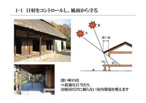 軒やバルコニーなどを利用し、夏は日差しを遮り、秋から冬、春にかけては日射を取り込み、冷暖房器具に頼らない室内環境、暮らしを実現させようとしています。