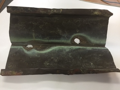 昔は 「銅は劣化しない、何百年ももつ」 って思われていましたので、25年以上前に建てた家ですとこの谷樋に銅板を使用していることが多かったのですが、雨によって酸化し、穴があいてくることがわかってからステンレスが使われるようになってきました。