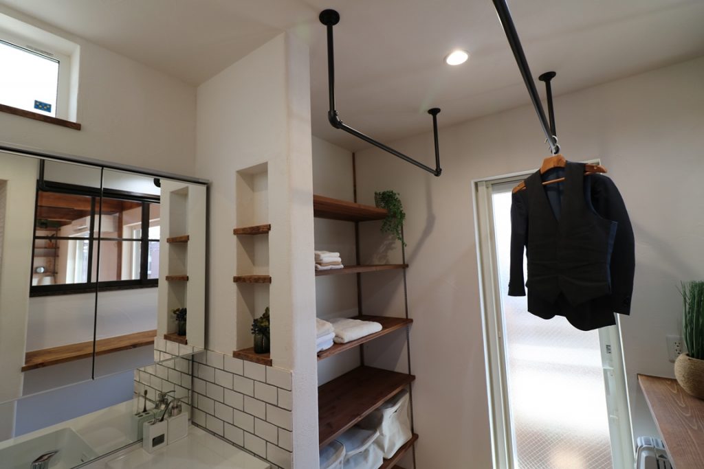 ランドリーコーナーの天井から釣り下がったハンガーパイプ。ブラックでまとめ、家事スペースなのに気持ちが上がるかっこいい仕上がりです。