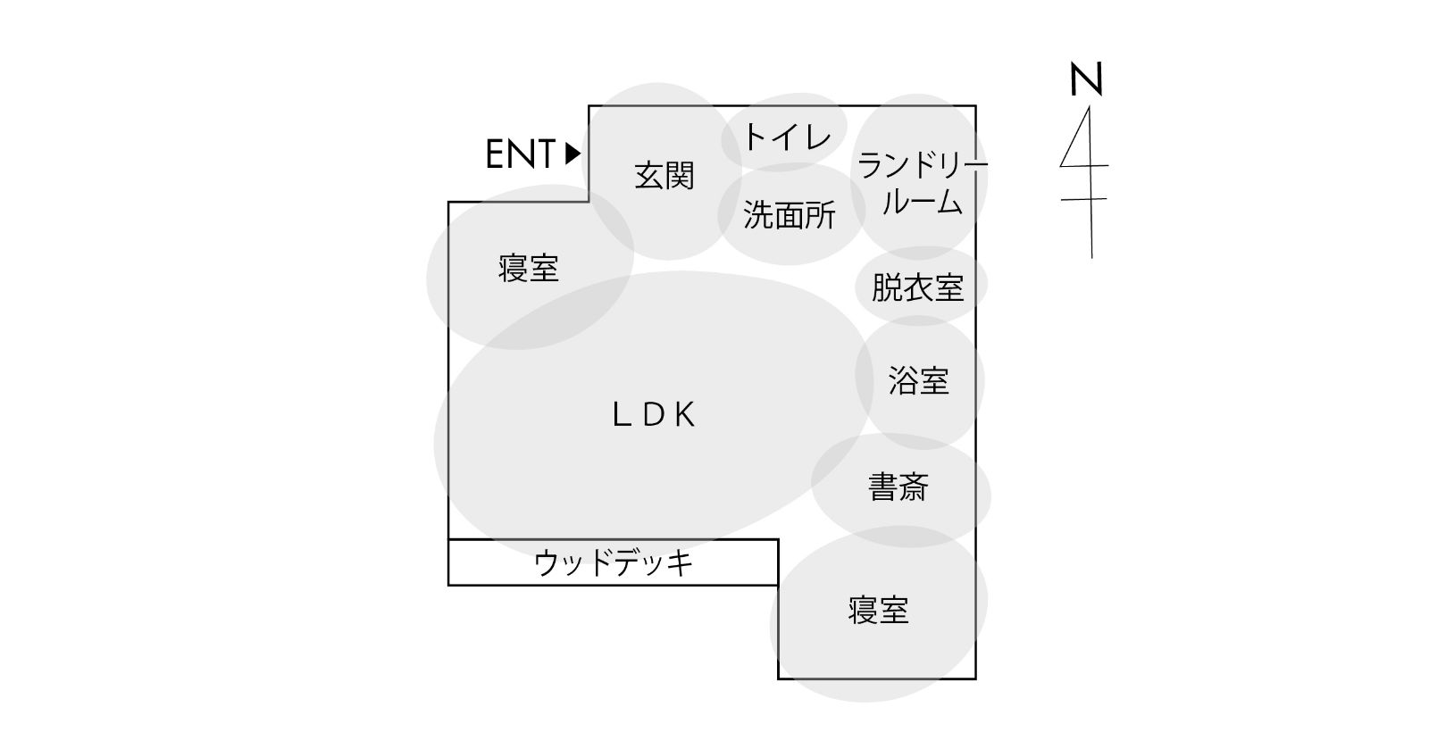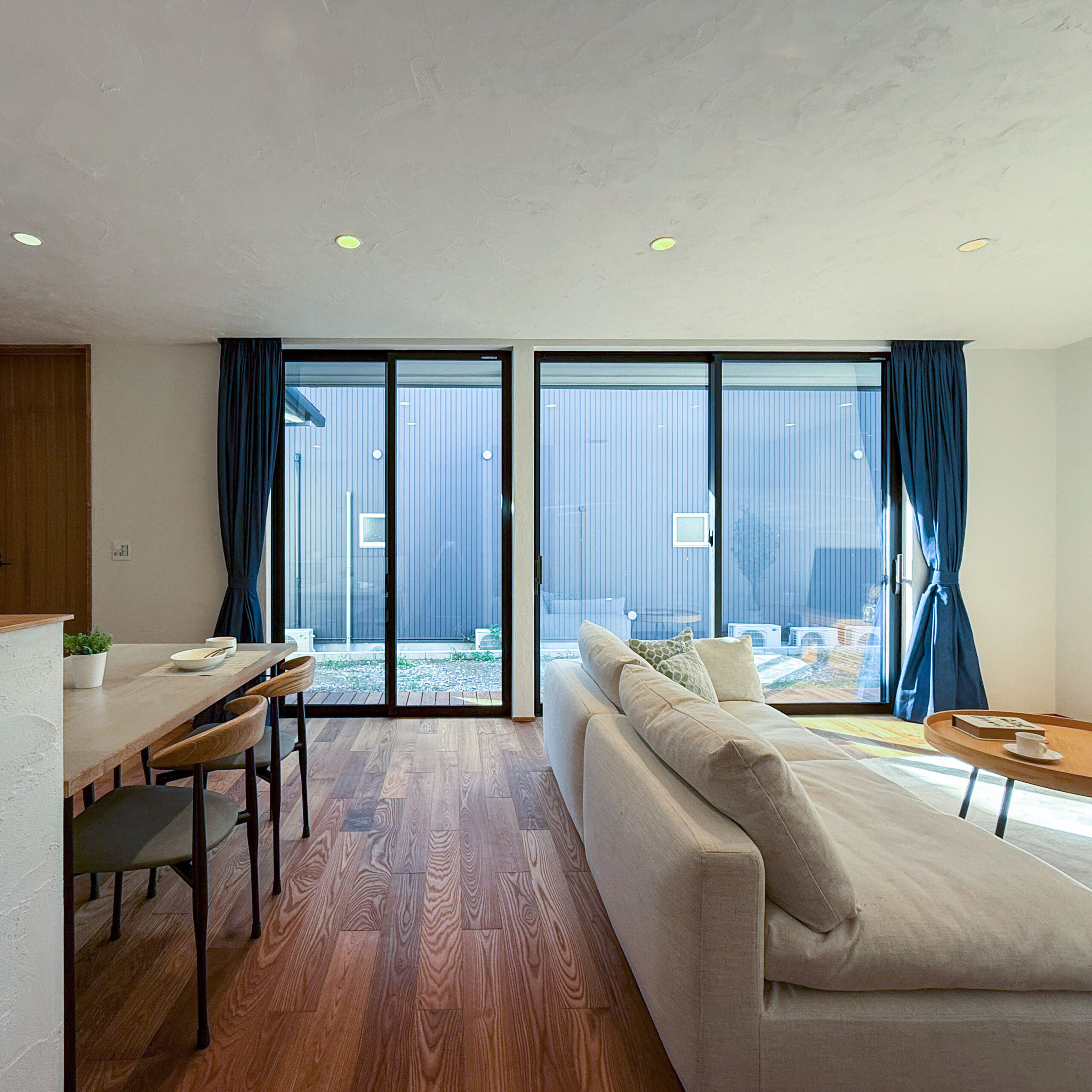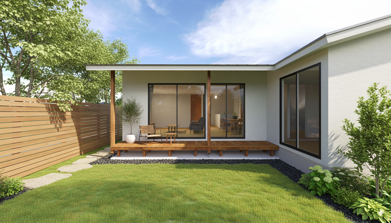 日射を調整する軒下、南向きの庭に縁側ウッドデッキ