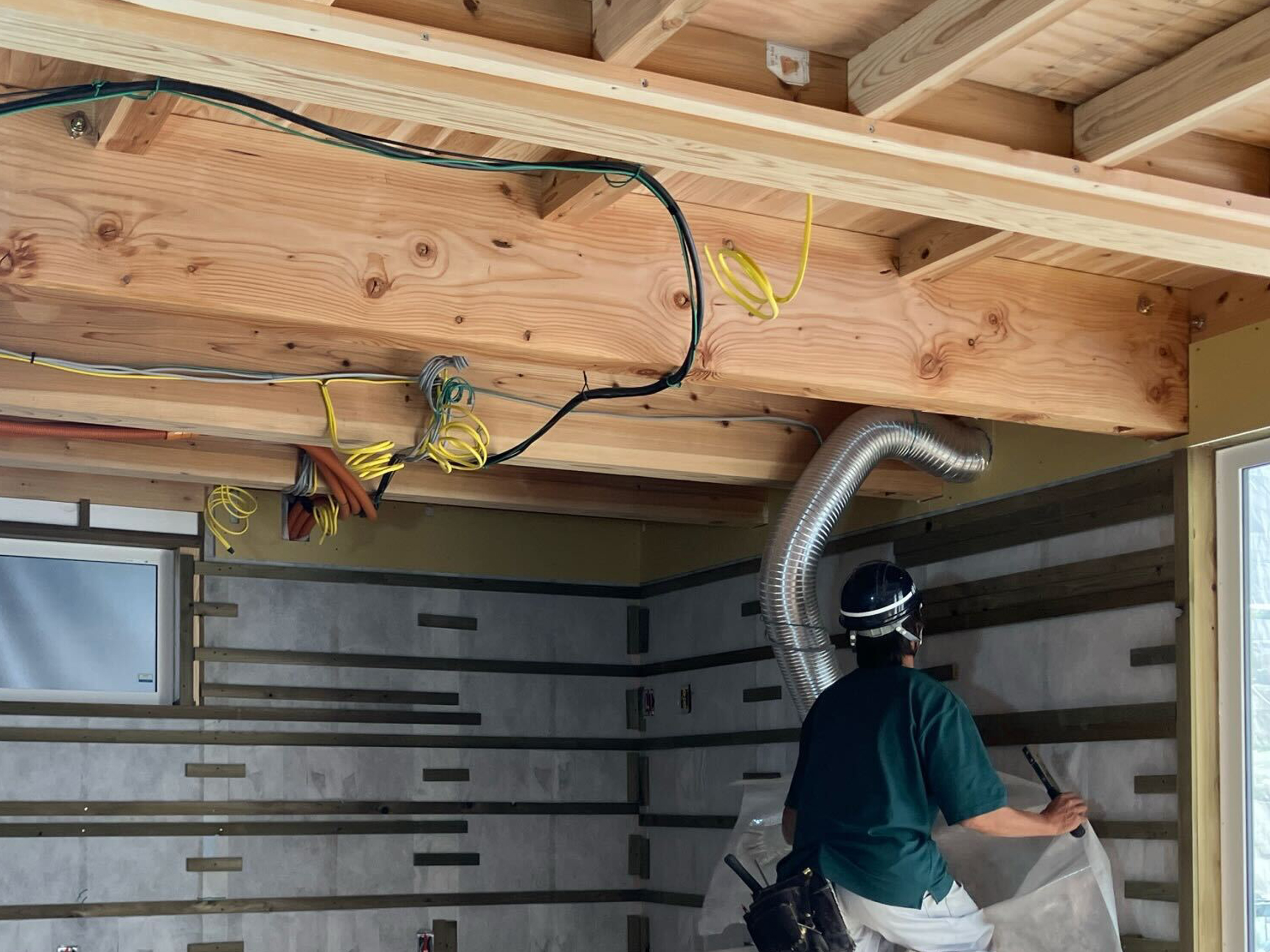 ・セルロースファイバーや外断熱が施工された壁の状態