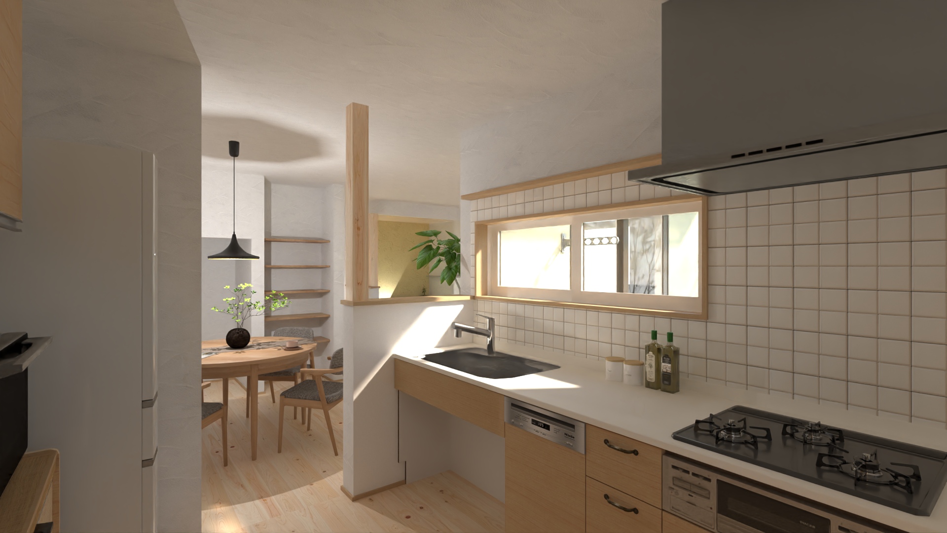 窓外の眺望を眺めながら料理ができる壁側キッチン