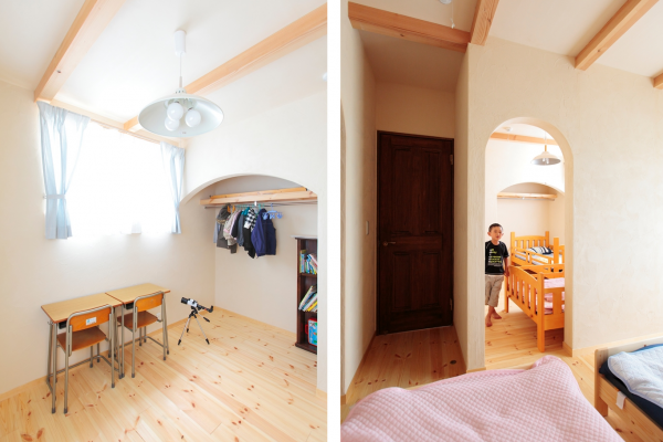 A.2階の主寝室と居室にアールの垂れ壁があって、お互いの部屋を行き来できるようになっていますが、打合せの時は子どもが2人だったので3人目ができたら、そこを子ども部屋にして将来的に垂れ壁部分を埋めてしまおうかなと。もし生まれなかったら書斎にしよう思って、どちらでも対応できるように間取りを考えましたね。