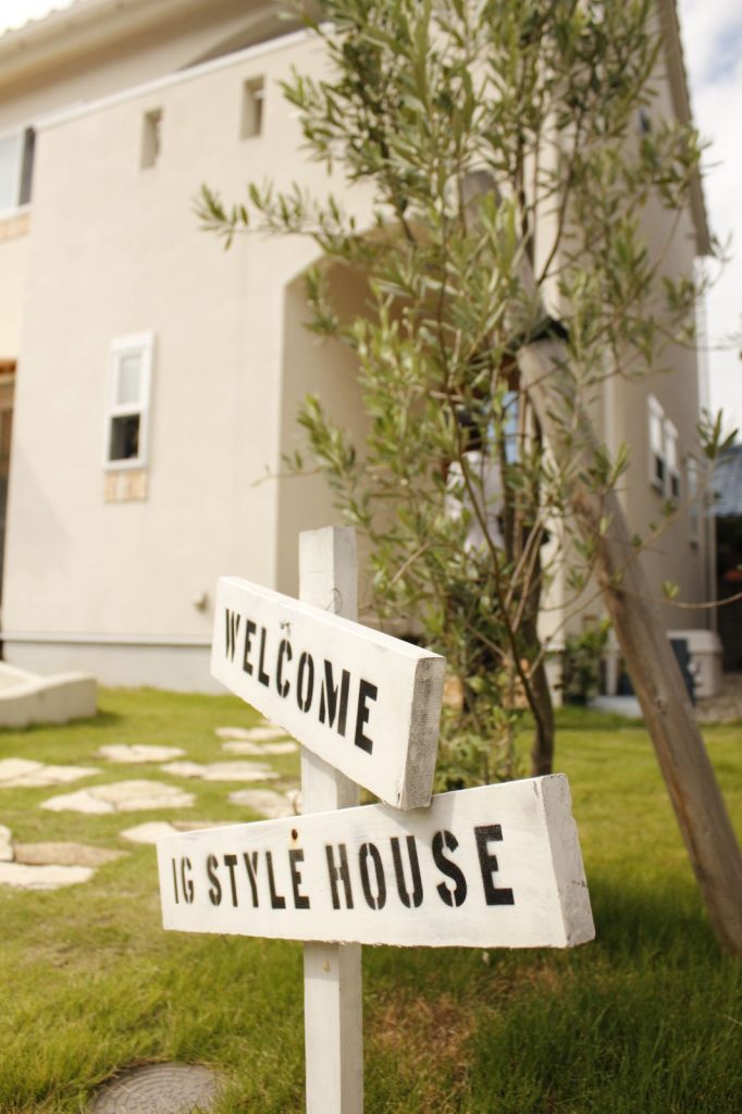 「家を建てるならば、合板・ビニールクロスなどの建材を使用した家は嫌だったんです。アイジーさんは素材にこだわっているし、いい家が建つだろうと思ったんです。」とお話くださったK様。そんなK様のお宅は住宅街の中で一際目を惹きました。そしてアプローチにはご主人手作りの「WELCOME TO iG STYLE HOUSE」というストリートサインが。このお気持ちが本当にうれしいものでした。