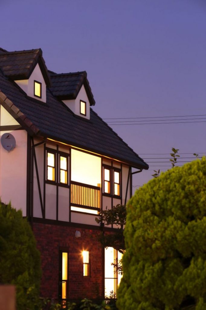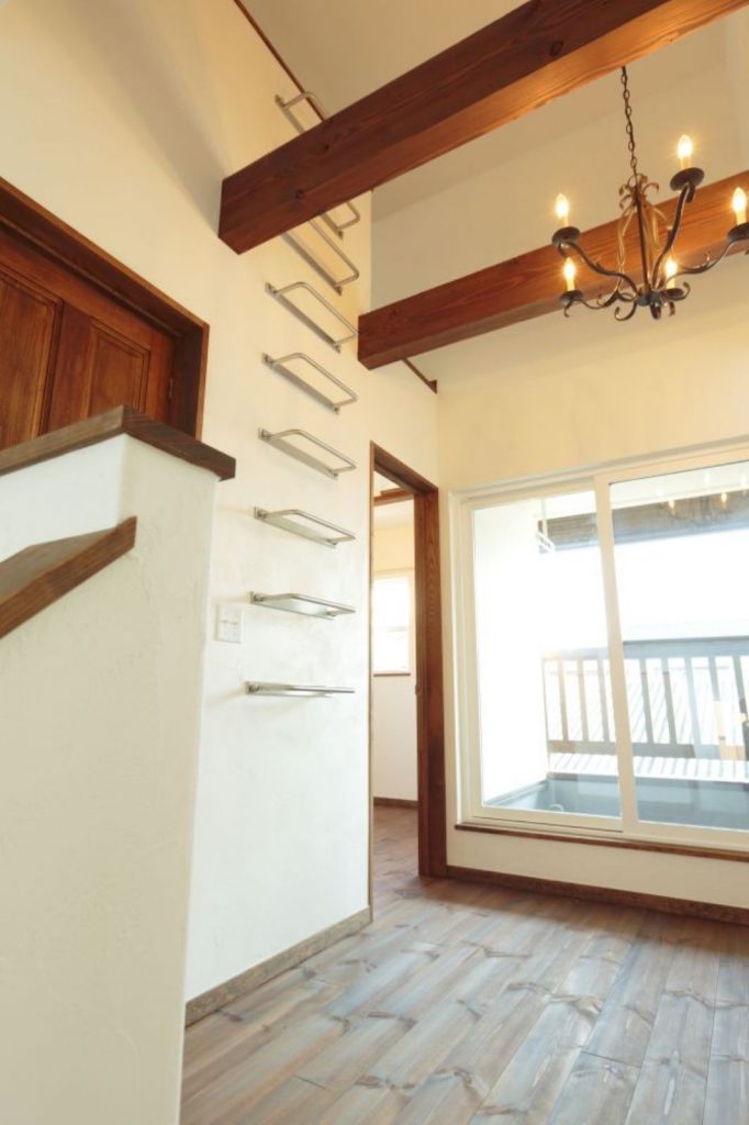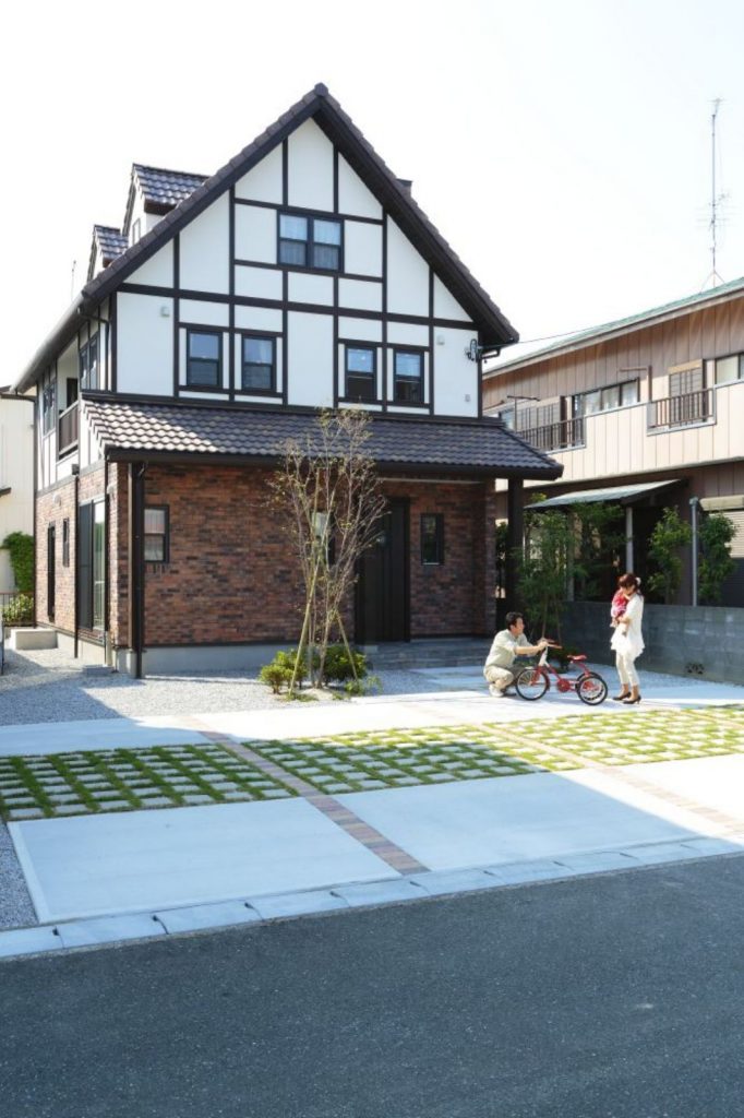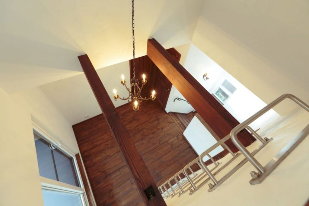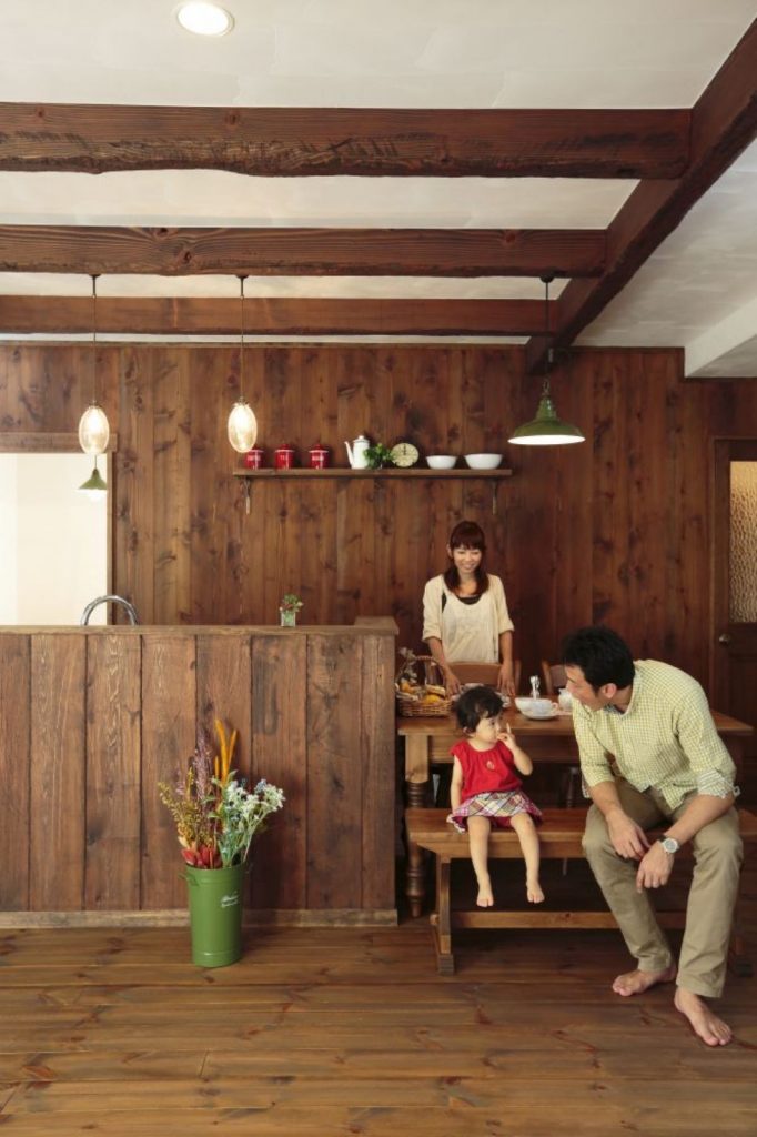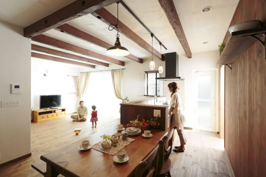 外壁は、1階部分はレンガ、2階部分は塗り壁と樹齢150年以上のレッドシーダーを使用し、イギリスの片田舎に佇んでいるような家をイメージしたS様邸。室内も落ち着いた色合いに仕上げるだけでなく、梁はエイジング加工を施し、新しいのにどこか懐かしさを感じられるような印象のアンティーク調の空間に仕上がりました。