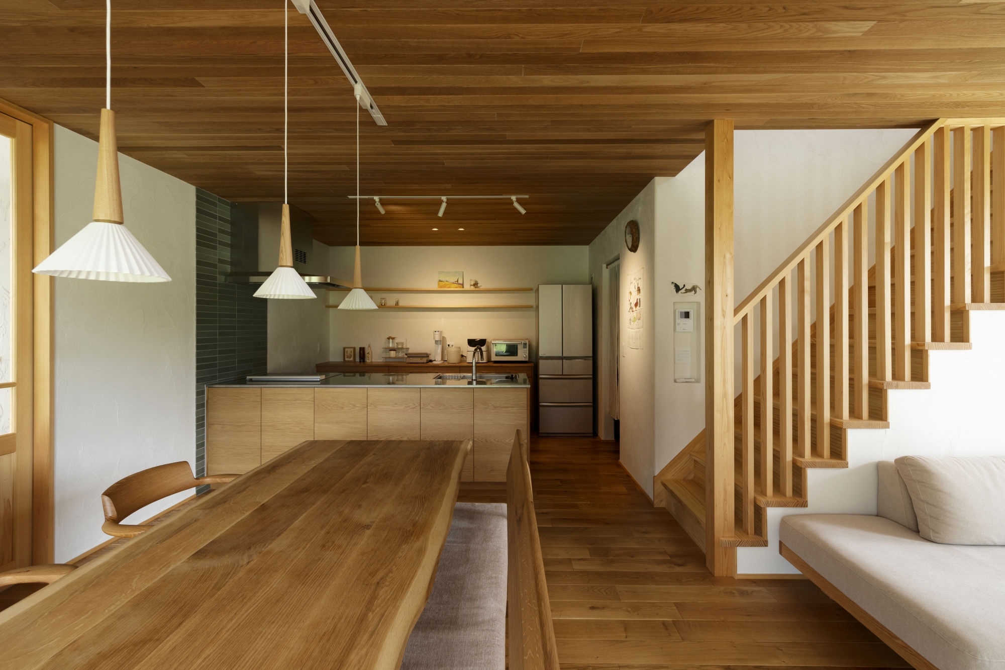 照明の色の好みが夫婦で違いアパートの頃もよくケンカしていましたが、最後には、昼白色の明るい照明に落ち着きました。影の部分があった方がオシャレに見えるし、夜も必要なところが明るければいいよねって。日中は明るくて電気を全部消してるぐらいです。