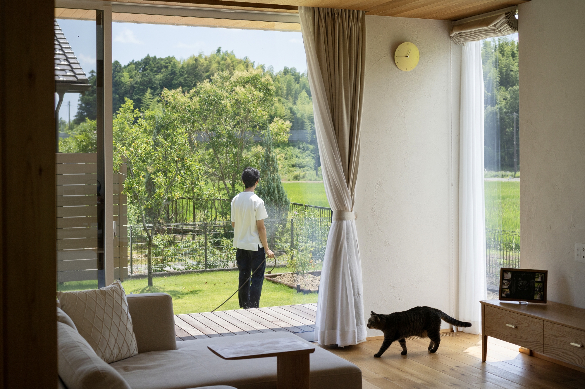N様: 壁の位置をどうするかで、かなり悩みました。本当は壁をなくして緑を全部見せたかったのですが、構造的に必要な壁をどこにするか?たくさんの案を作ってもらい、リビングから庭が一番広く見える今の配置に決めました。